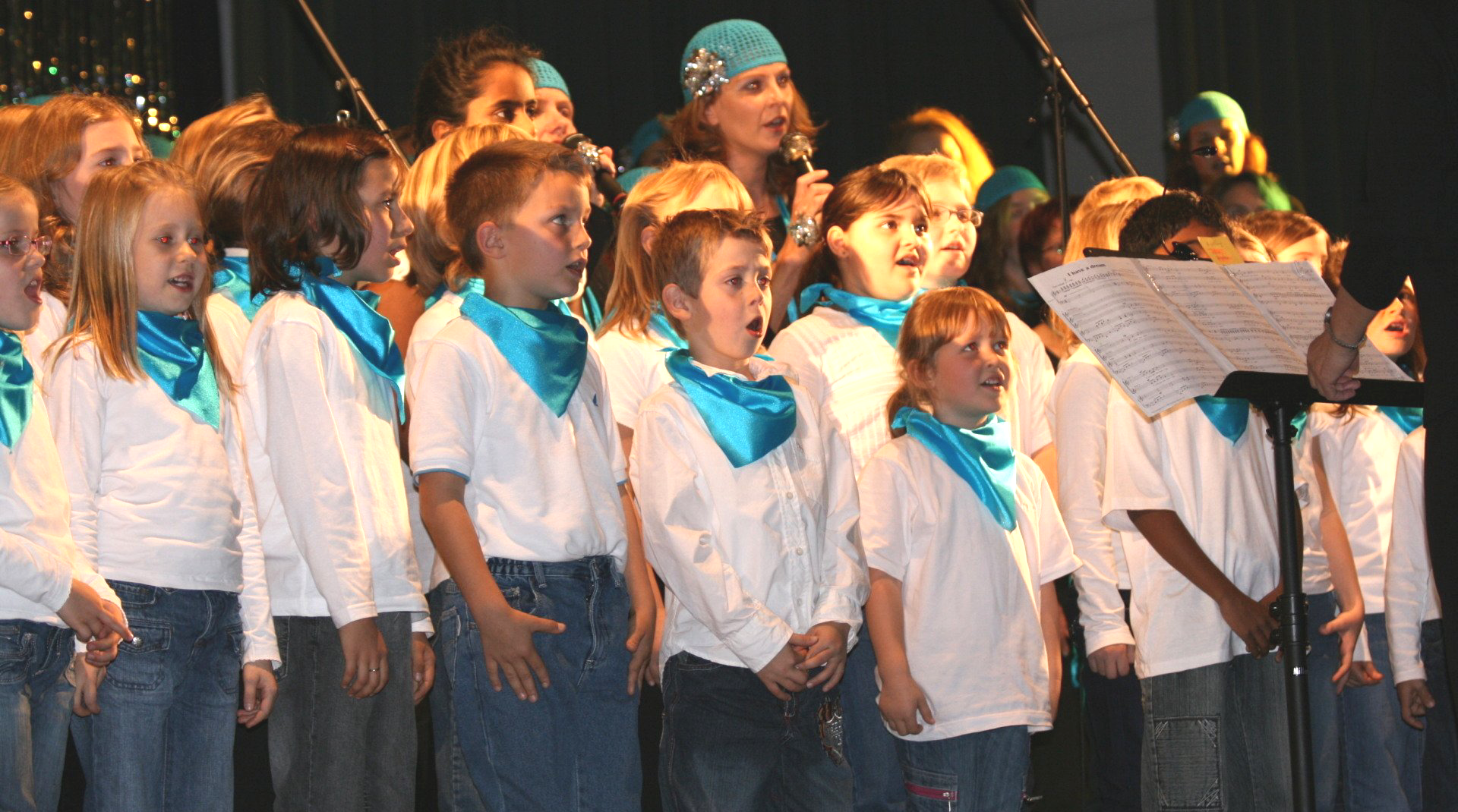 Doch die Zuschauer irrten, wenn sie glaubten, sich aufs Zuhören, Dahinschmelzen und Applaudieren beschränken zu können. In der folgenden Umbaupause erhielten sie mal eben eine kleine „Singstunde“ von Marita Kröll. Ganz Chorleiterin gelang es ihr in wenigen Minuten die komplette Halle mit den Refrainzeilen aus dem Lied „Afrika“ auf die den nun folgenden Konzerthöhepunkt einzustimmen. Und was nun kam, war schlichtweg atemberaubend. Lichtstimmung, Steppenkulisse und das Intro von Marita Kröll versetzte das Publikum von einem Moment zum nächsten in die Ferne. Zu Trommelrhythmen und afrikanischem Gesang tanzten die Sängerinnen und Sänger auf die Bühne, um dann die Menschen in der Halle mit „Afrika“, gesungen nach den Originalpartituren von Ingrid Peters, mit Musicalsongs aus „König der Löwen“ und weiteren Liedern des dunklen Kontinents zu verzaubern. Und auch hier krönten die „Bösersisters“ Vanessa, Bianca und Karina mit ihren Soli das Programm, die im übrigen mit ihrer „performance“ jede wie auch immer besetzte Casting-Jury problemlos an die Wand singen könnten.