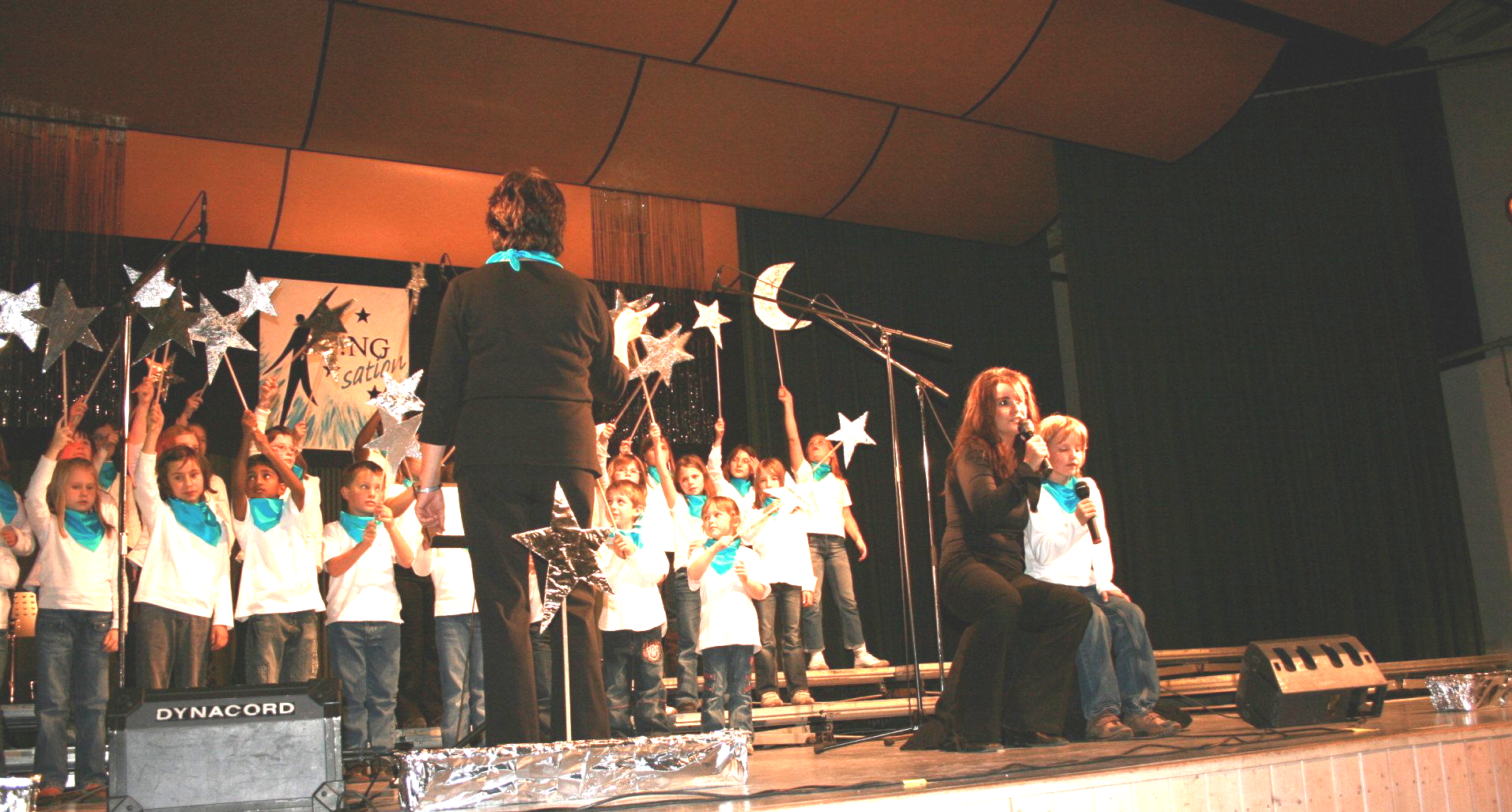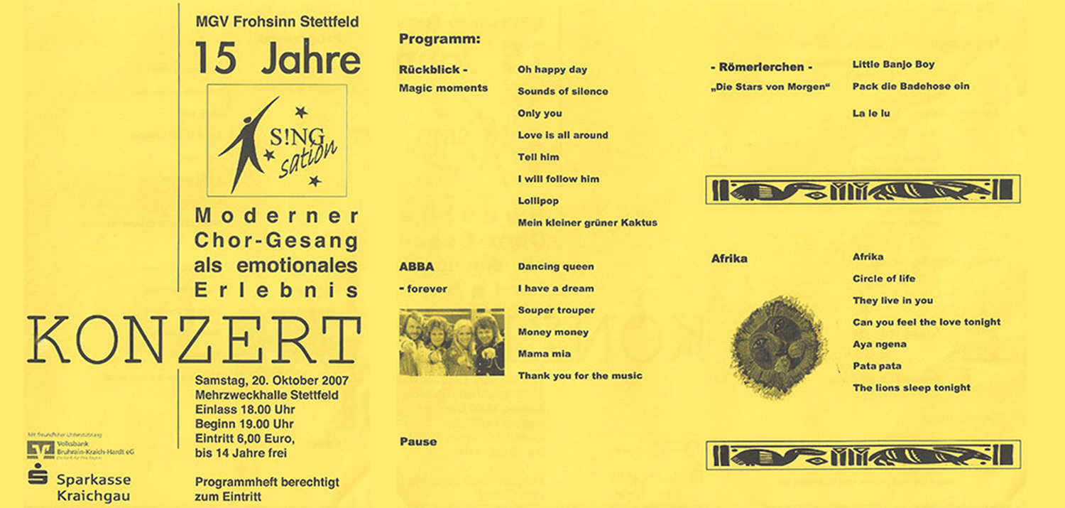 Gänsehaut, Herzklopfen, Wärme.“ Das versprach der erste Vorsitzende des MGV Markus Rothfuß am Samstagabend den Zuschauern in der voll besetzten Stettfelder Mehrzweckhalle. „Moderner Chorgesang als emotionales Erlebnis.“ Unter diesen Titel hatte die junge Gesangsformation S!NGsation ihr Konzert anlässlich ihres 15-jährigen Bestehens gestellt. Und das, was die 550 Gäste zu hören und zu sehen bekamen, war all das – und noch viel mehr! Vier Hauptthemen hatte Chorleiterin Marita Kröll mit ihren Sängerinnen und Sängern vorbereitet und in einer grandiosen Inszenierung auf die Bühne gebracht. Live unterstützt durch vier Musiker der Bigband Bajazzo hatte sich bis zur Pause die prophezeite Gänsehaut beim Publikum bereits mehrfach eingestellt. Im ersten Programmteil wurde musikalisch zurückgeblickt auf 15 Jahre junger Chor. Und das mit einem Feuerwerk aus guter Laune und der versprochenen Emotionalität. Denn ob bei „Oh happy day“ mit nur weiblichen Stimmen oder mit männlicher Unterstützung bei „Mein kleiner grüner Kaktus“ – alle Chormitglieder transportierten ihre pure Freude am Singen bis weit in die Reihen des Publikums. Einen glanzvollen Abschluss setzten sicherlich Bianca und Vanessa Böser mit ihrem „Tell him“, im Original von Céline Dion und Barbara Streisand gesungen. Auf diesen äußerst bewegenden Konzertmoment folgte Teil zwei mit einem schwungvollen ABBA-Potpourri. Und wie die großen Popstars aus Schweden im Londoner Wembley-Stadion erhielt auch der S!NGsation-Chor bei „I have a dream“ Unterstützung vom Kinderchor – hier den Stettfelder Römerlerchen und – den 550 Zuhörern in der Halle, die den Text von einer Leinwand ablesen und mitsingen konnten. Nach „Thank you for the music“ schloss der Vorhang zur Pause und öffnete sich rund 20 Minuten später wieder, für den Auftritt der „Stars von morgen“ – der Römerlerchen. Vor 15 Jahren hatte Marita Kröll Sängerinnen, die aus den Kinderchor-Schuhen herausgewachsen waren, versammelt und zu dem jungen Chor formiert, der sich an diesem Samstagabend mit einer unbeschreibliche Gesangsvielfalt präsentierte. Mit mindestens so viel Begeisterung wie die großen zeigten auch die kleinen Sängerinnen und Sänger ihr Können mit „Little Banjo Boy“ und „Pack die Badehose ein“. Auch hier sorgte ein Solistenpart, dieses Mal von Tanja Morr und ihrem Sohn Benjamin, für Gänsehaut und feuchte Augen, als die beiden das von Heinz Rühmann bekannte „La le lu“ sangen.