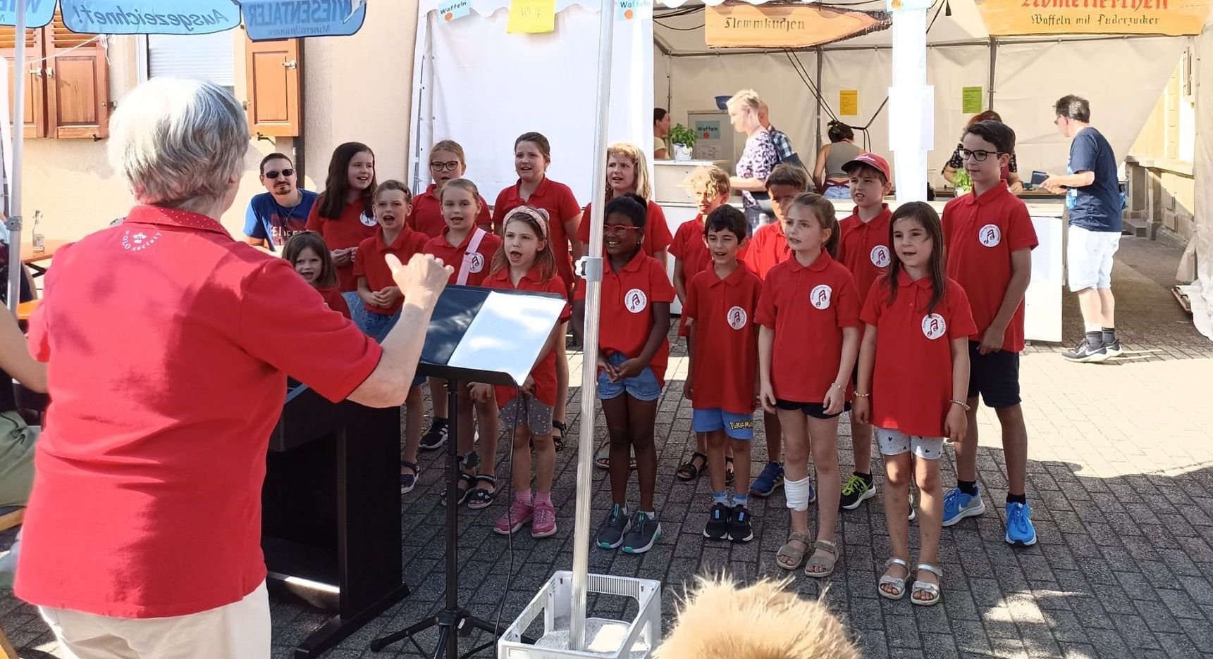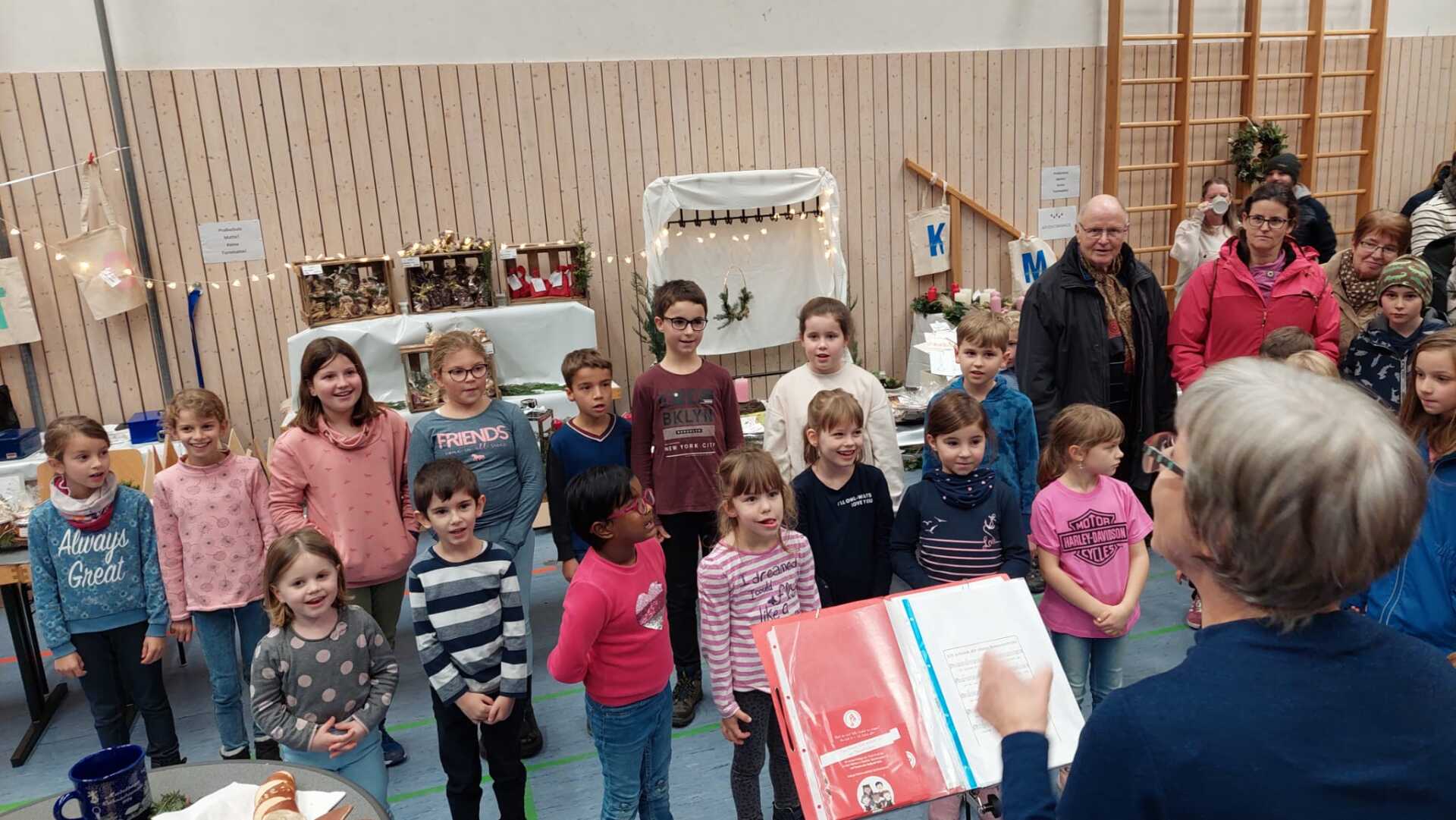 Beim Adventsbasar der Grundschule und des Kindergartens Stettfeld sorgten die Römerlerchen mit ihrem Auftritt nicht nur für viele zusätzliche Besucher sondern auch für die erste Einstimmung auf die Adventszeit. Mit 6 Liedbeiträgen aus ihrem Repertoire zeigten die kleinen Sängerinnen und Sänger, was sie so alles draufhaben. Der Einladung der Dirigentin Marita Kröll, mitzusingen‚ folgten die Besucher des Basars gerne. So sang man gemeinsam den „Bruder Jakob“, selbstverständlich in drei Sprachen. Und als zum Abschluss „Die Weihnachtsbäckerei“ angestimmt wurde, sprang der Funke so richtig über!